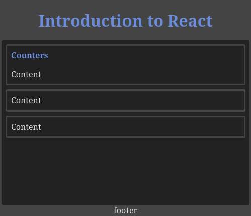 Vous devriez obtenir 3 cartes sans titre dans votre application puisqu'aucune valeur n'a été affectée au paramètre title lors de la création des composants Card dans le composant App. Cependant, dans la page, l'espace du titre est réservé même si celui-ci n'a pas de valeur. Pour résoudre ce problème, vous rendrez l'affichage de l'élément HTML header du composant Card conditionnel à la valeur de la props title. Plusieurs solutions sont envisageables, la plus courante et la plus concise est probablement l'utilisation de l'opérateur paresseux « && ».